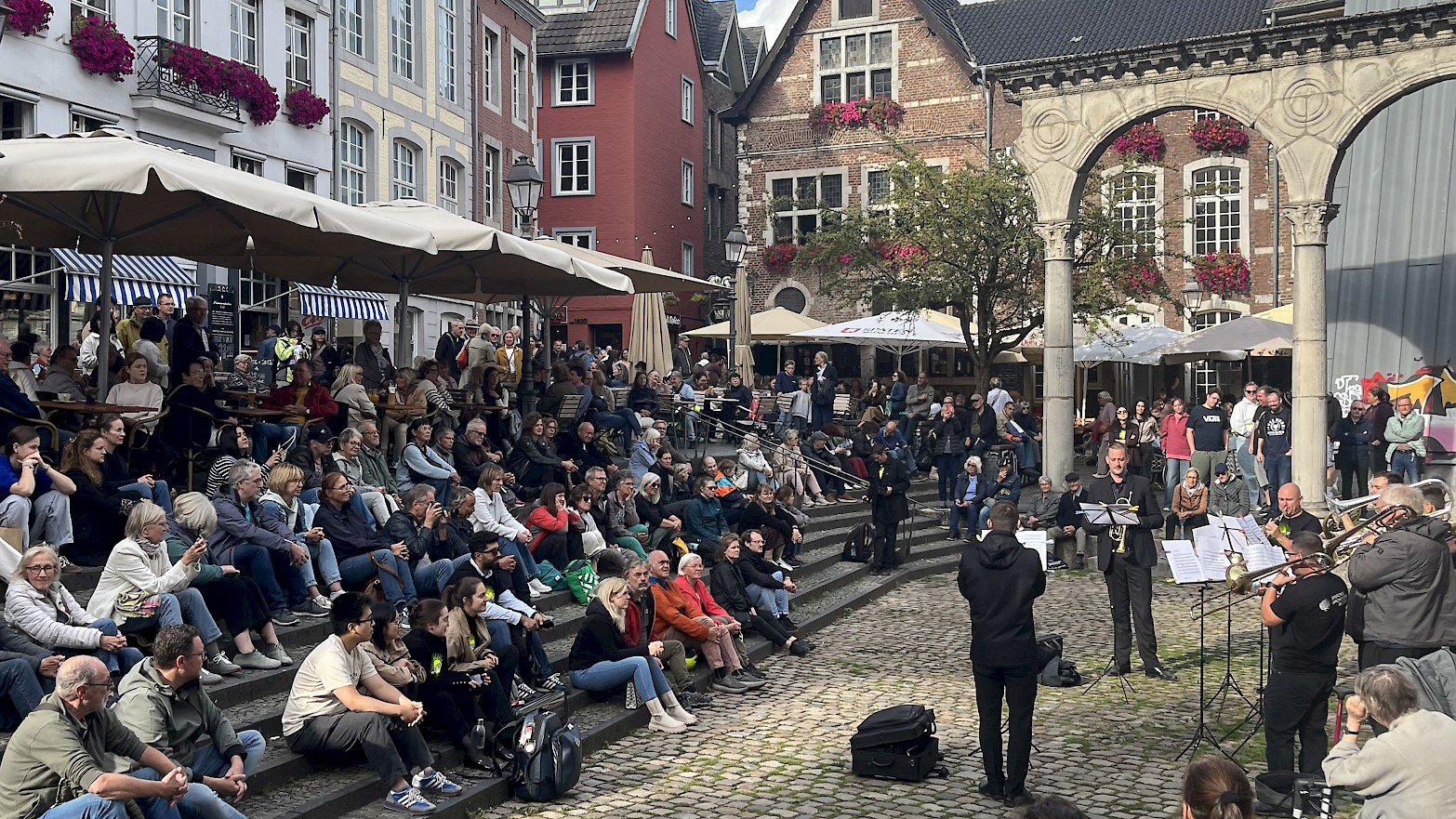 Das war wieder ein großartiger Erfolg: Das Sinfonieorchester Aachen unter der Leitung von Generalmusikdirektor Christopher Ward begeisterte im September mit seiner Musikmeile viele Menschen in der Aachener Innenstadt, unter anderem im Hof, am Elisenbrunnen, im Elisengarten und vor dem Theater. Mitveranstalter waren wie in den Vorjahren die Musik- und Theaterfreunde Aachen mit ihrem Voristzendem Thomas Beaujean.